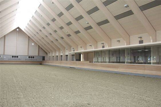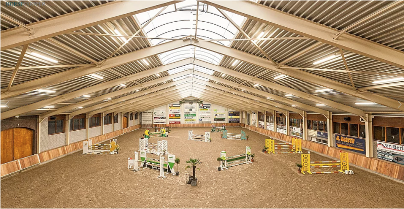 Dit is onze nieuwste en meest grote binnenbak. De rijbaan is 25 x 65 m en is daardoor een van nederlands grootste binnerijbanen. De baan is van een goede eb en vloed bodem voorzien net als onze andere rijbanen. De baan word gebruikt voor lessen en door pensionklanten.